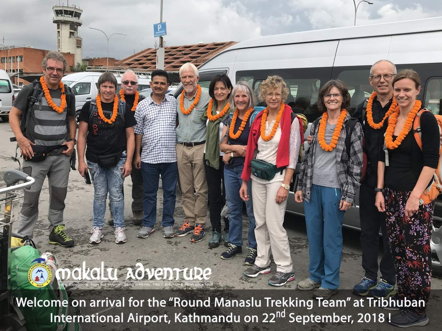A team of 10 avid trekkers from Switzerland arrived in Kathmandu on 22 September for the Manaslu Trekking in Nepal. The team was warmly received at Tribhuvan International Airport in Kathmandu by Mr. Mohan Lamsal - MD Makalu Adventure. Lead by Mr. Christian Schmid, the strong team of 10 members were hosted a warm welcome dinner with Live Nepalese Culture Show on the second day of their Kathmandu arrival. The team departed Kathmandu for the trip on 24th September by driving to Gorkha and then to Soti Khola Bank (710m) – the starting point of                Manaslu Trekking in Nepal. The team is scheduled back in Kathmandu on 14th October before flying back home (Switzerland) on the following day -16th October.